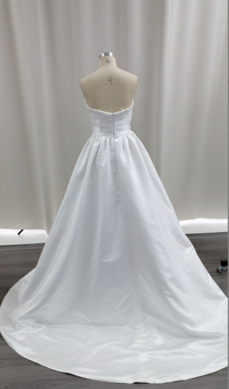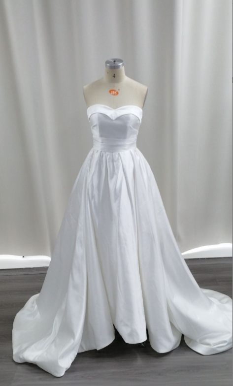 Luxurious satin A-line strapless wedding dress with a sweeping train and a chic split-front detail, perfect for a modern bridal look.