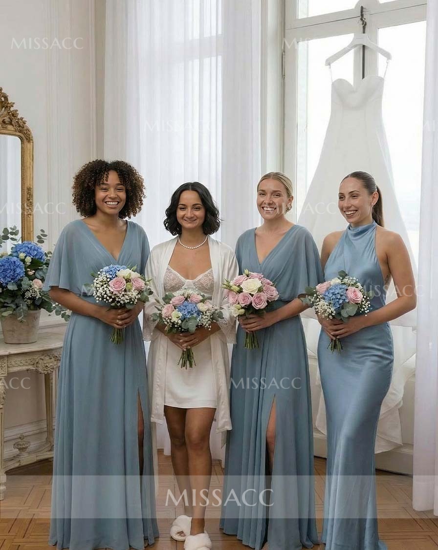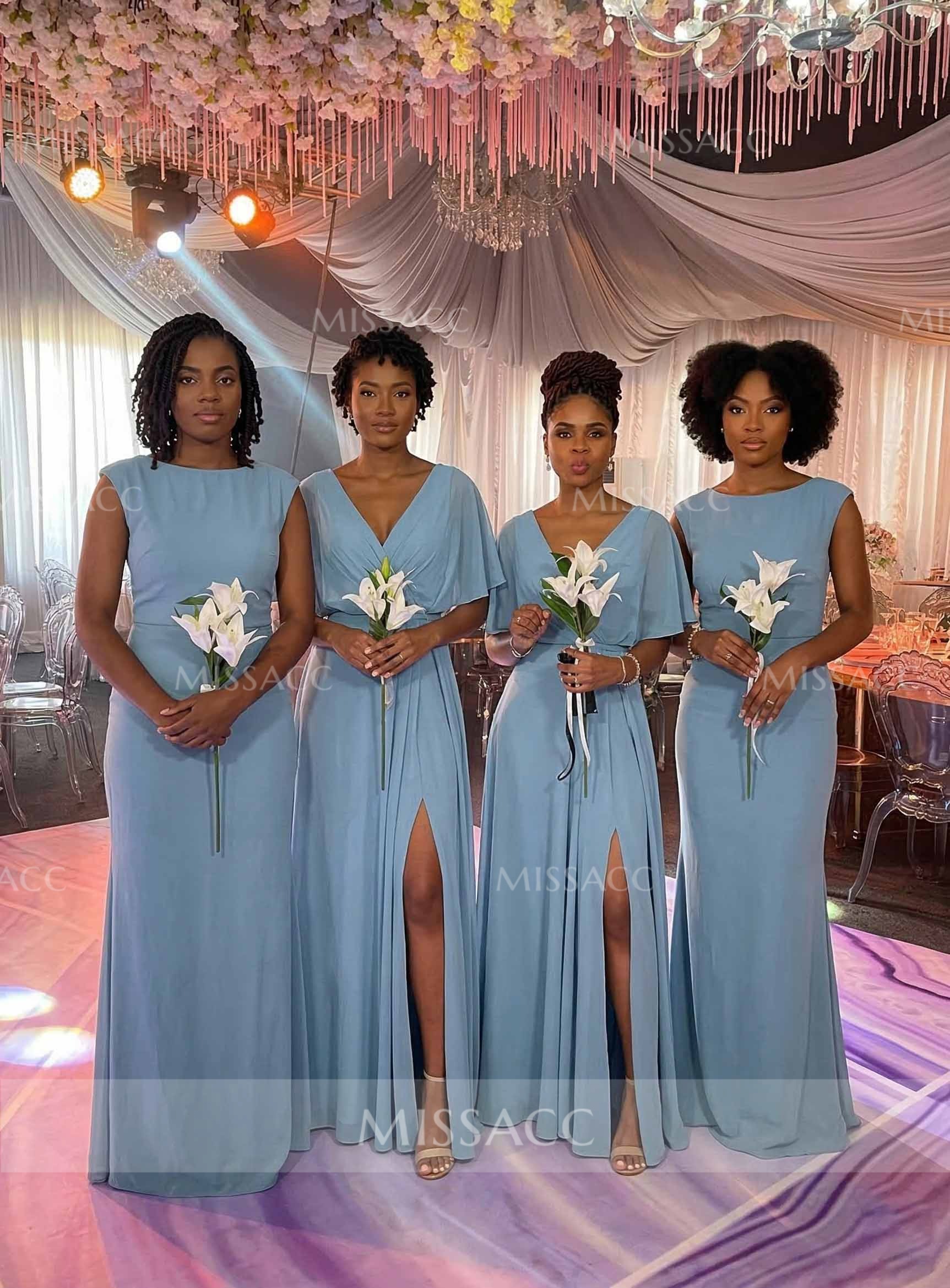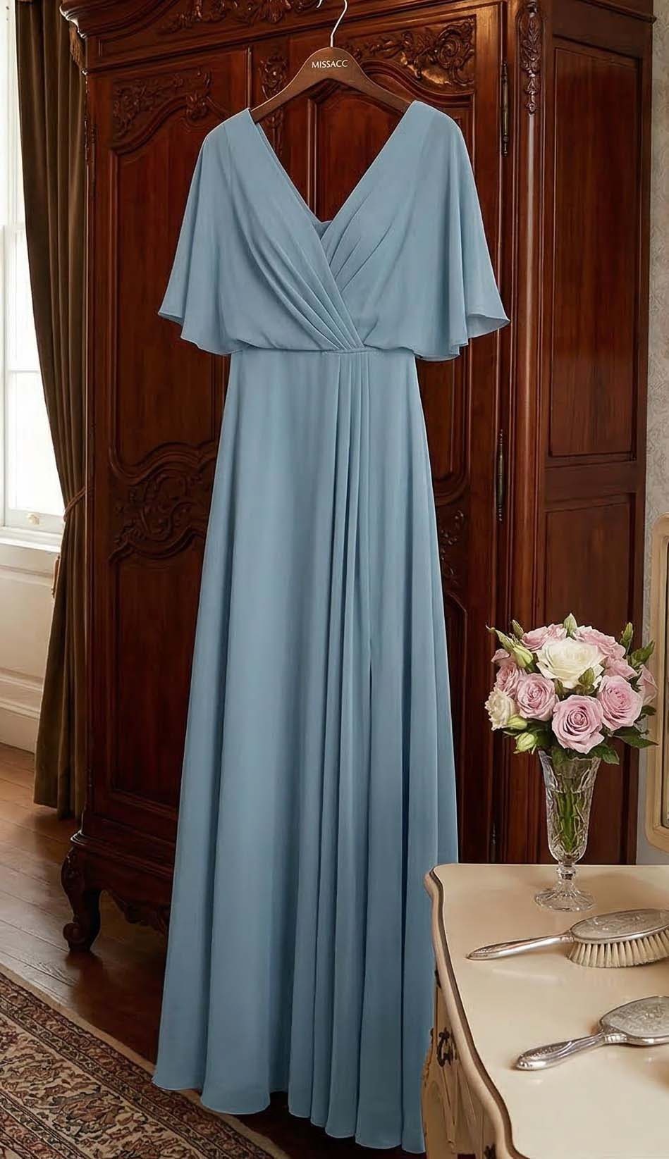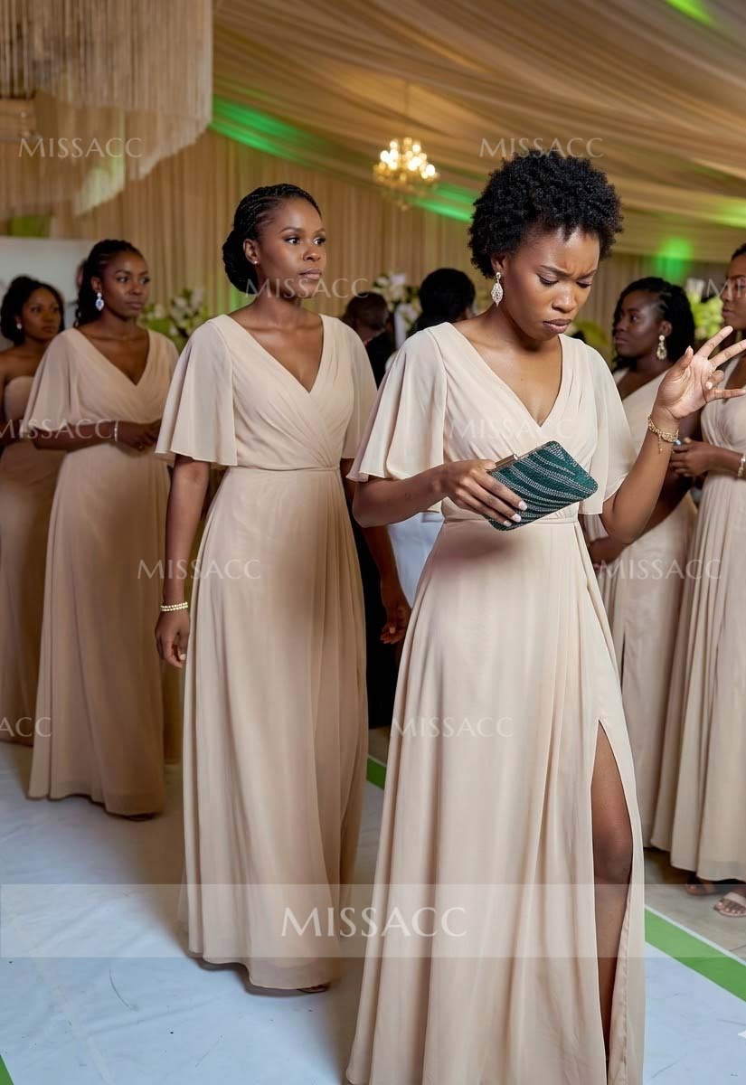 Elegant A-line V-neck chiffon bridesmaid dresses with high split, perfect for weddings and special events, crafted with premium materials for a flattering fit.