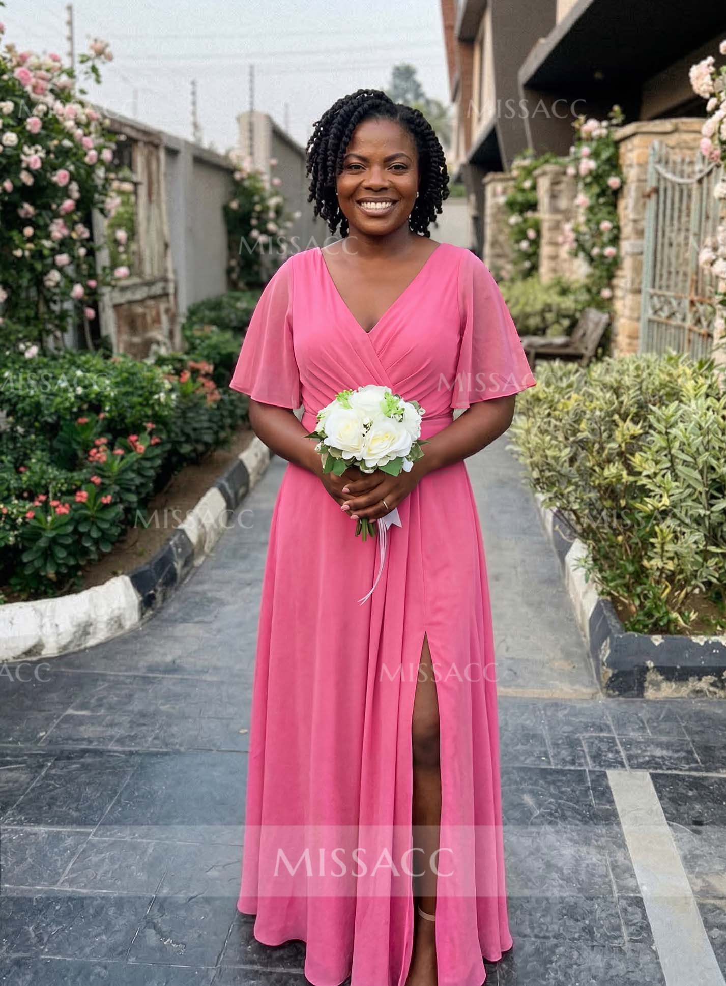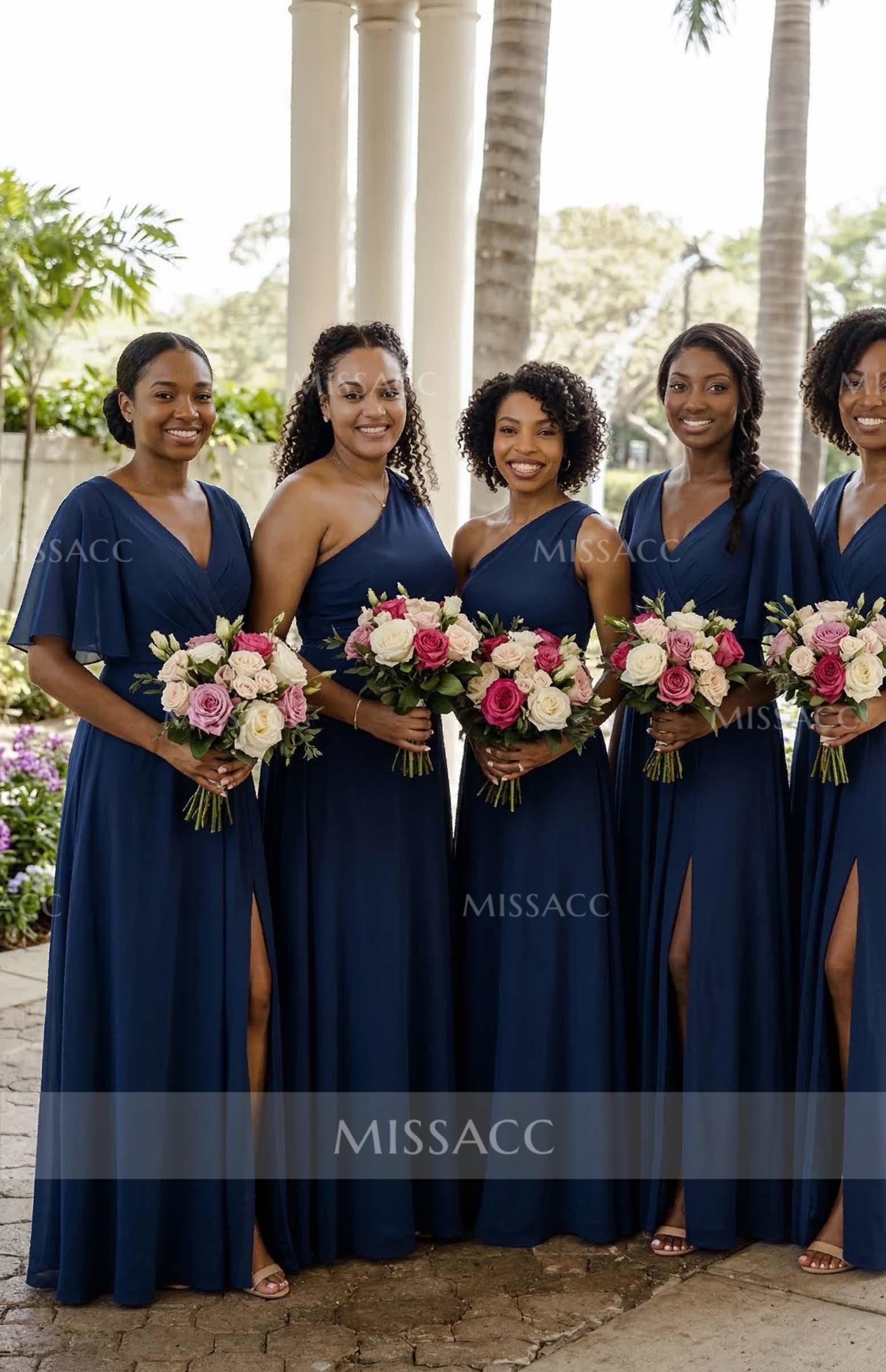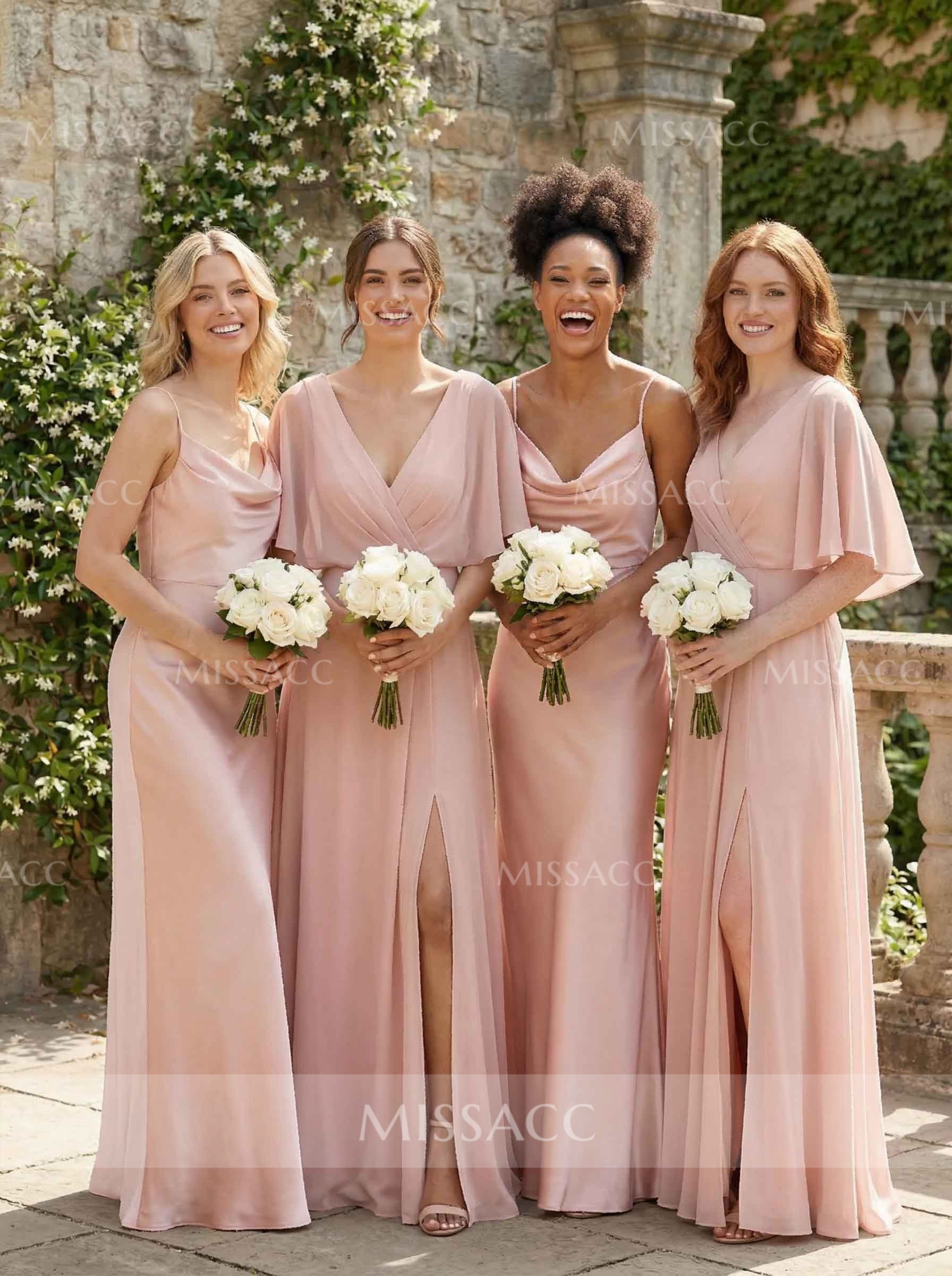 Elegant A-line V-neck chiffon bridesmaid dresses with high split, perfect for weddings and special events, crafted with premium materials for a flattering fit.