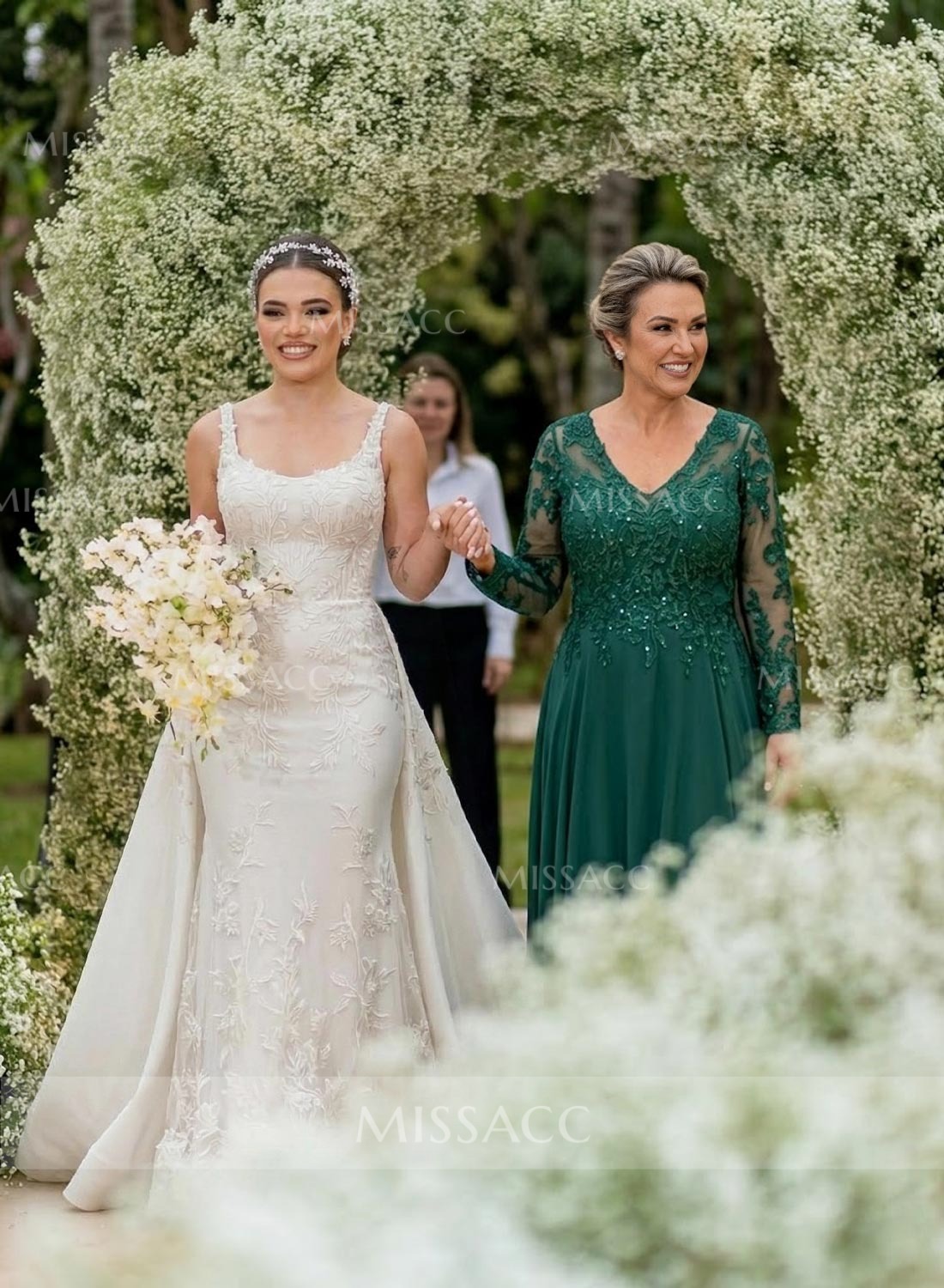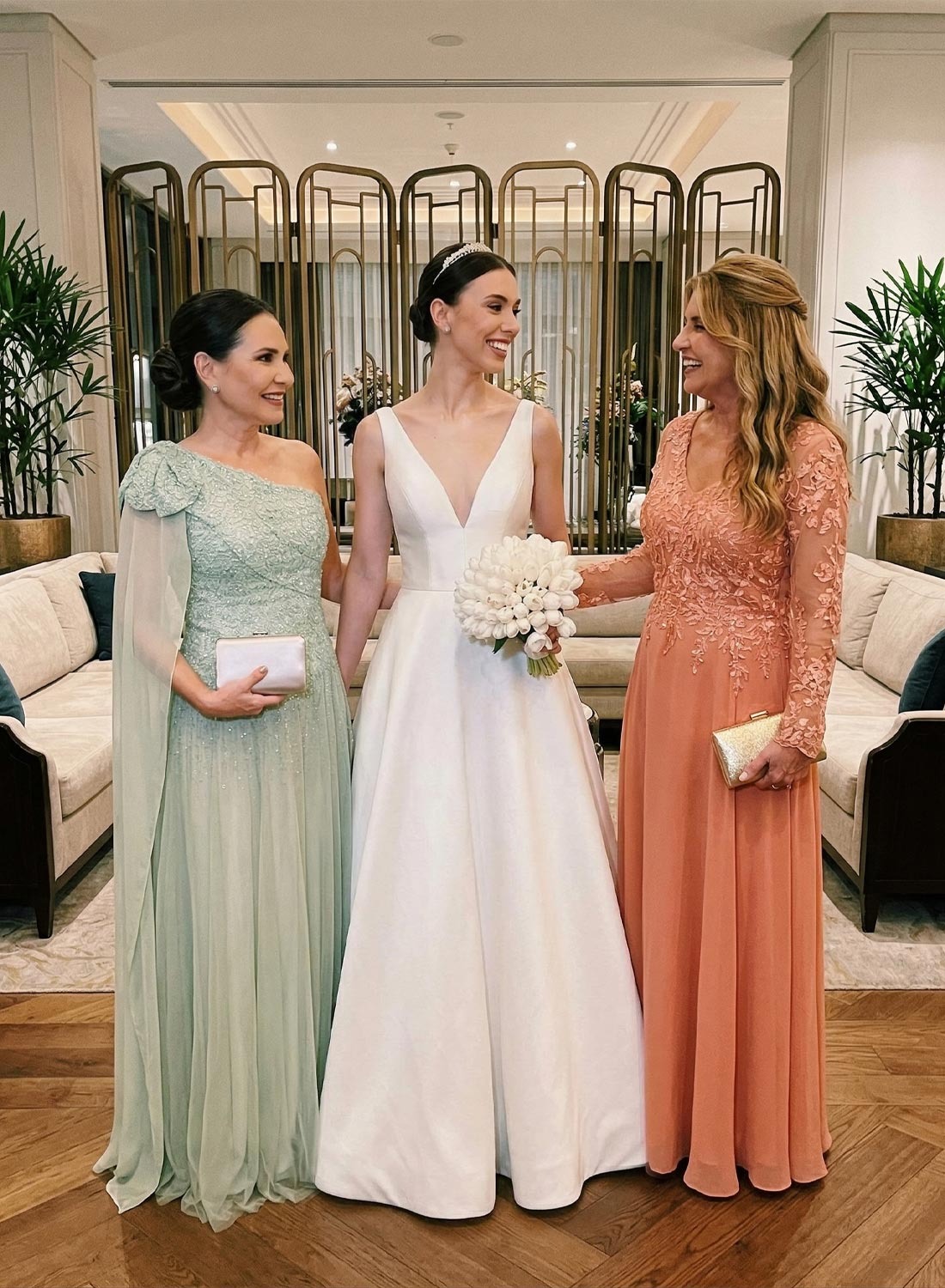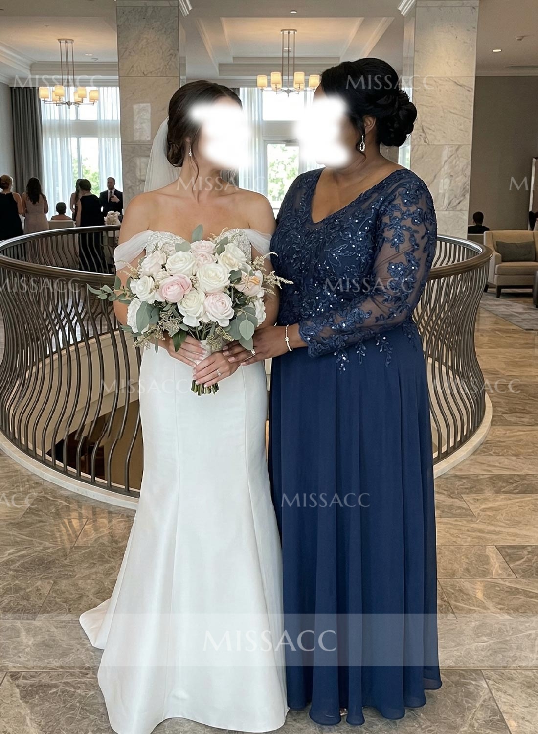 I absolutely loved wearing this dress! The delicate floral lace appliques on the bodice and sleeves added such a romantic touch to the overall look. It flowed beautifully when I walked, and I received so many compliments from family and friends. The V-neckline was flattering without being too revealing, and the long sleeves provided the perfect amount of coverage. It made me feel elegant and confident standing next to my daughter on her big day. Highly recommend this style for any mother of the bride!