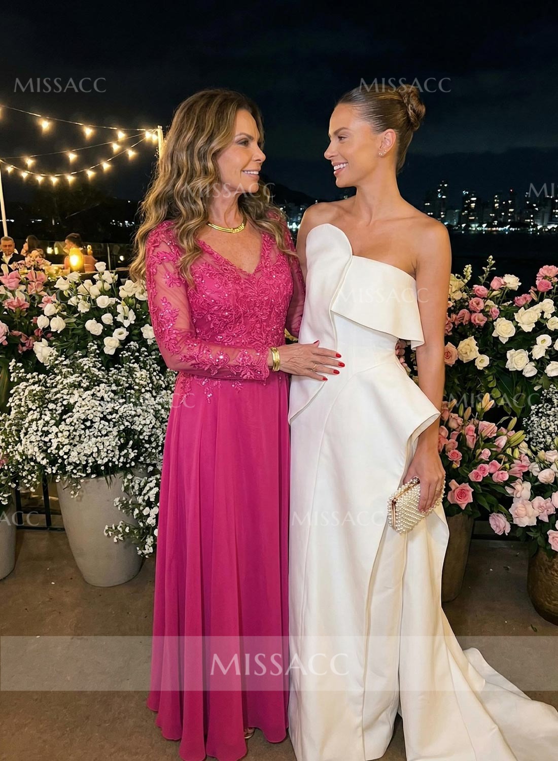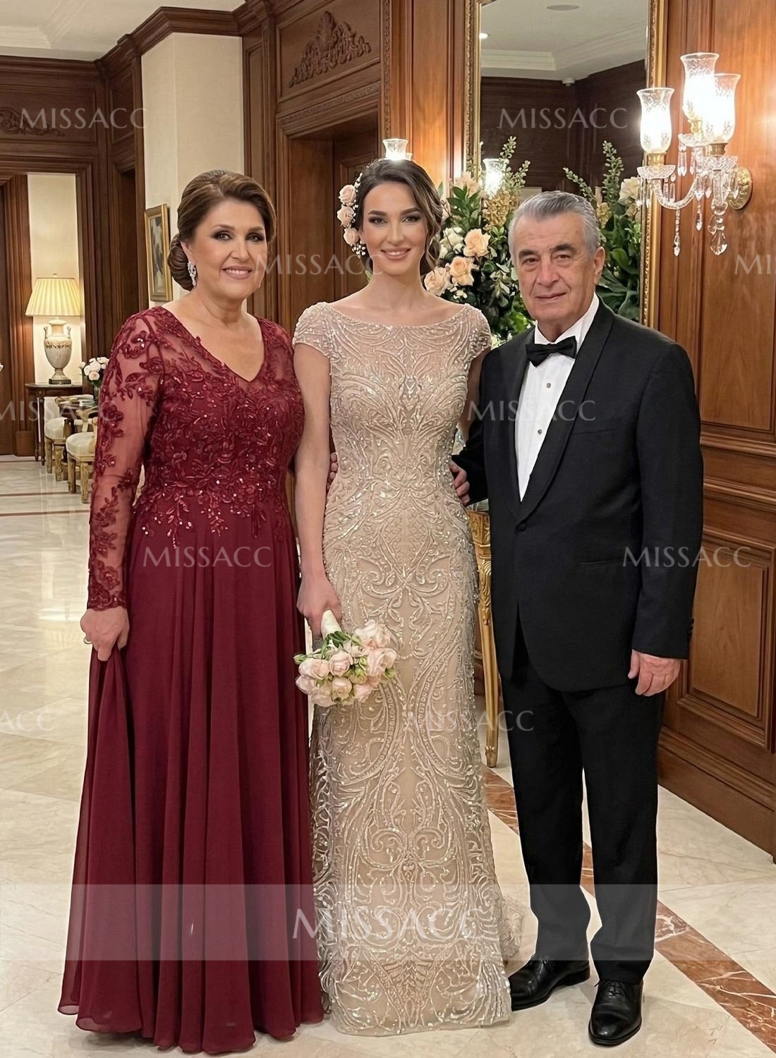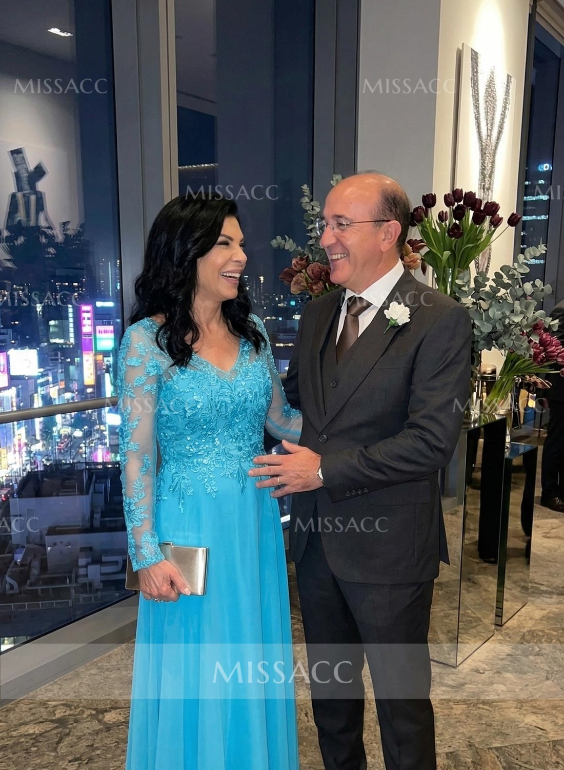 I absolutely loved wearing this dress! The delicate floral lace appliques on the bodice and sleeves added such a romantic touch to the overall look. It flowed beautifully when I walked, and I received so many compliments from family and friends. The V-neckline was flattering without being too revealing, and the long sleeves provided the perfect amount of coverage. It made me feel elegant and confident standing next to my daughter on her big day. Highly recommend this style for any mother of the bride!
