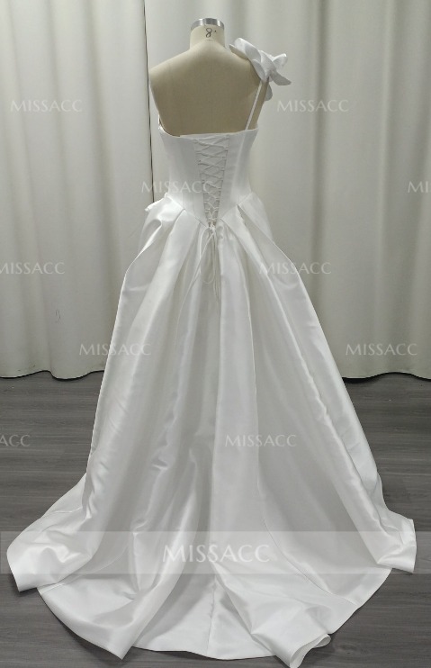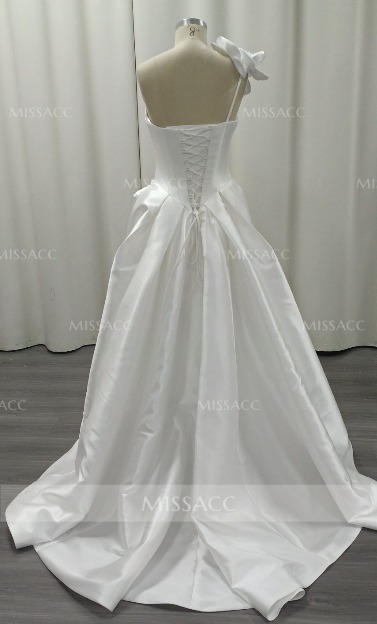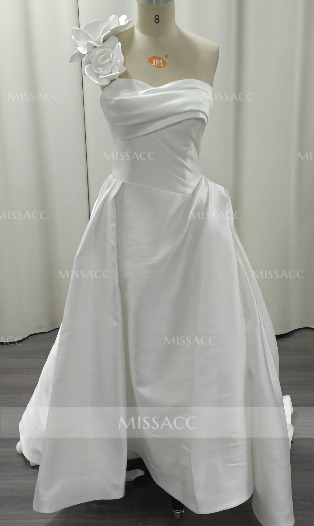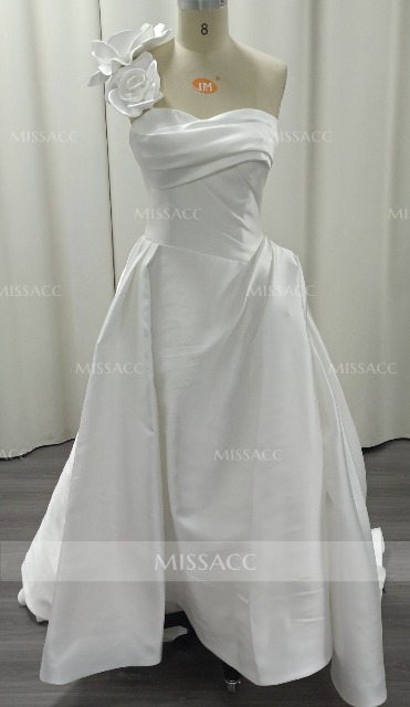 Ball-Gown One-Shoulder Sleeveless Sweep Train Matte Satin Wedding Dresses With Flower(s) #SWD12883