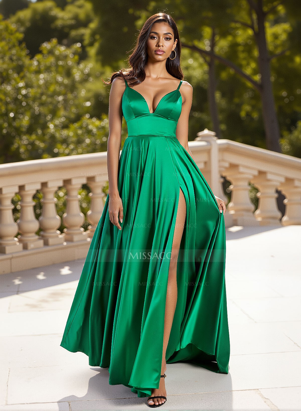Classic V-Neck Spaghetti Straps High Split A-Line Sweep Train Silk Like Satin Prom Dresses
