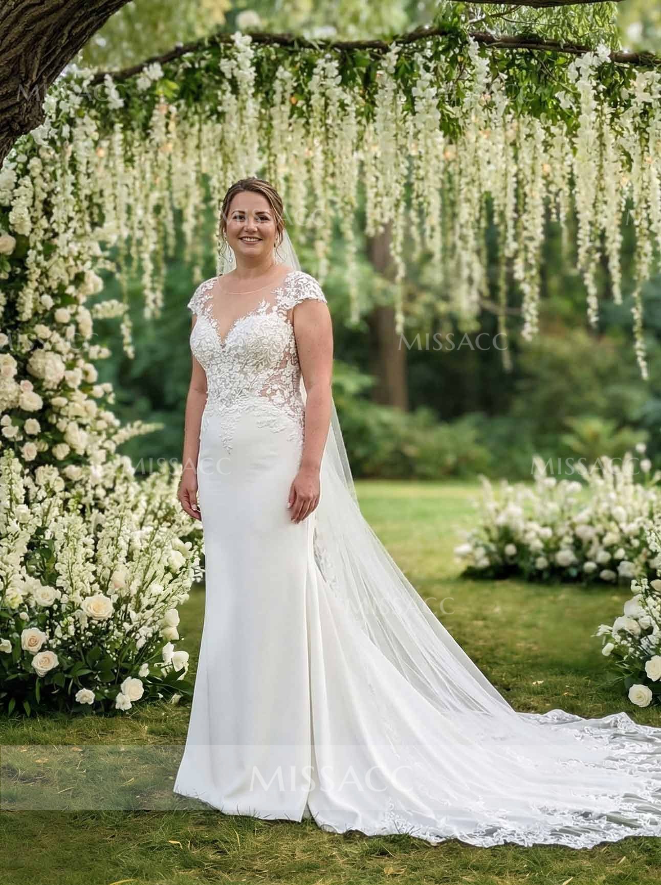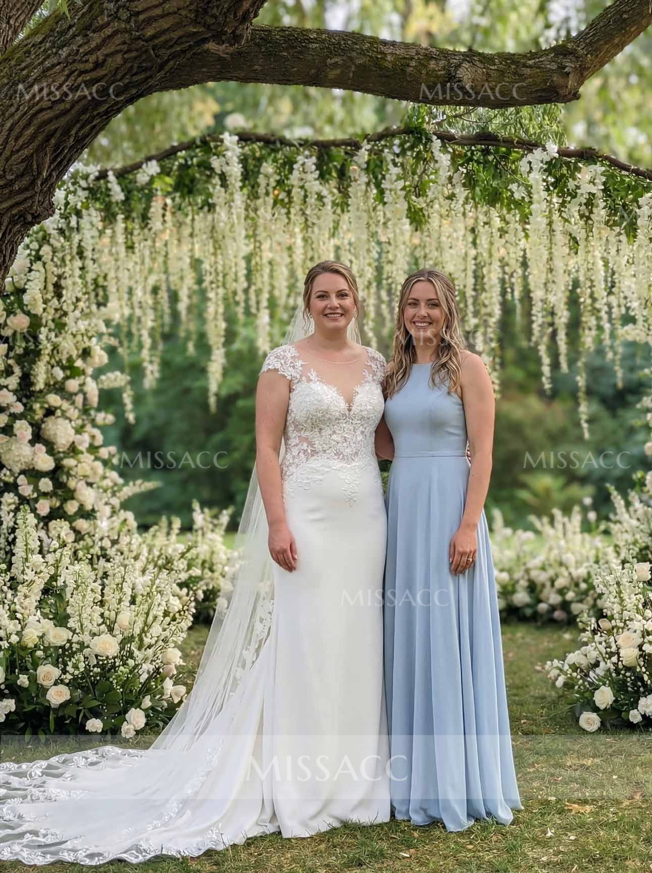 Discover this stunning A-line wedding dress featuring illusion neck, open back, and intricate floral lace and tulle. Perfect for romantic beach or garden weddings, this sleeveless bridal gown ensures breathtaking charm.
