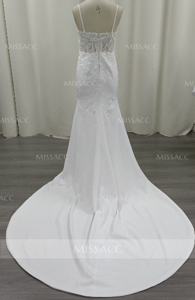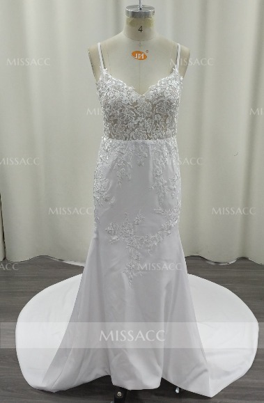 Elegant V-Neck Spaghetti Straps Sleeveless Mermaid Court Train Lace/Elastic Satin Wedding Dresses #SWD12748