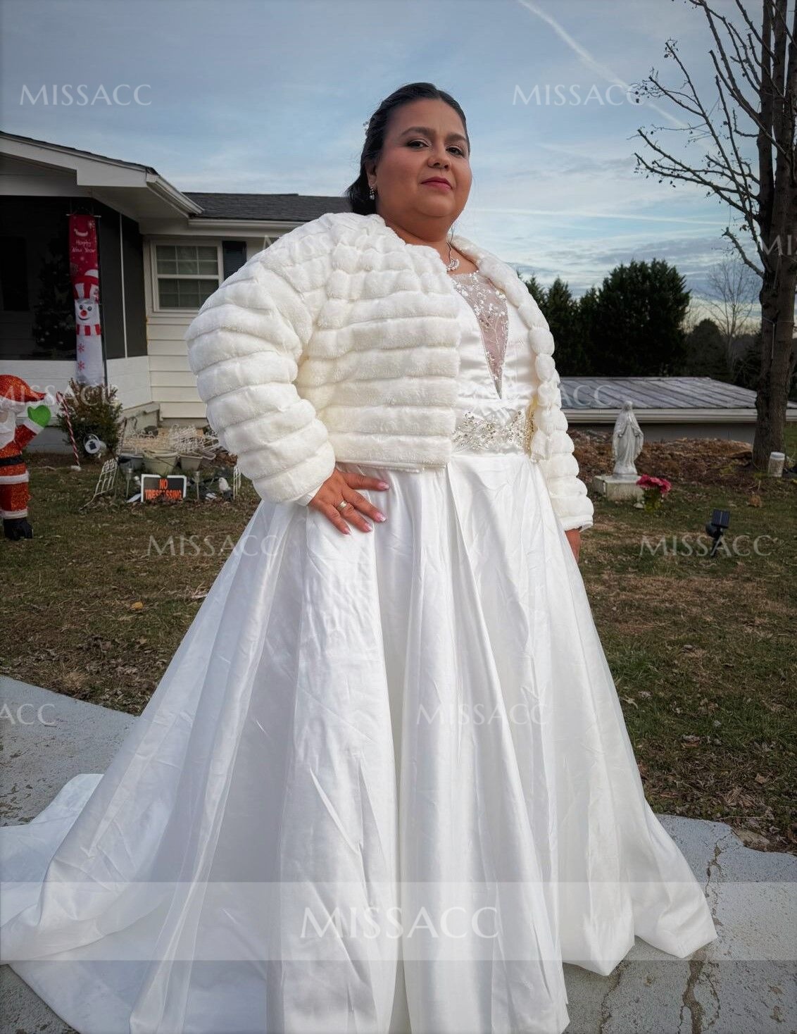This dress is absolutely dreamy! The sweeping train adds such a regal touch, and the long sleeves are perfect for a winter wedding. The color is a tad darker than in the picture, but it still looks stunning. The sizing is a bit off, but it's nothing a quick tailor can't fix. Very happy with my purchase!