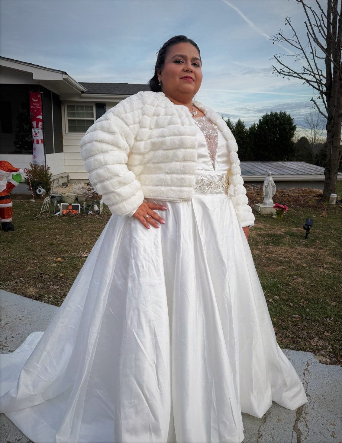 This dress is absolutely dreamy! The sweeping train adds such a regal touch, and the long sleeves are perfect for a winter wedding. The color is a tad darker than in the picture, but it still looks stunning. The sizing is a bit off, but it's nothing a quick tailor can't fix. Very happy with my purchase!