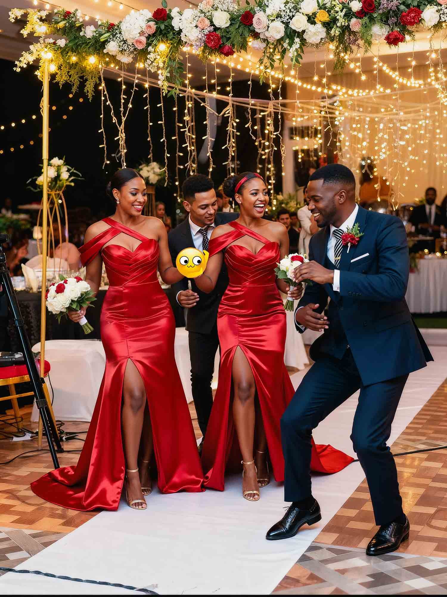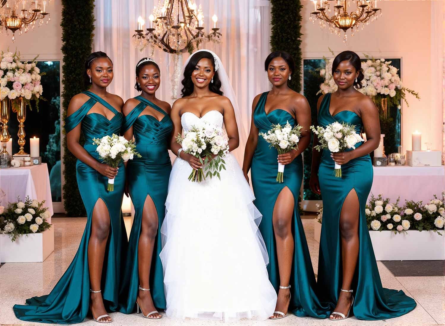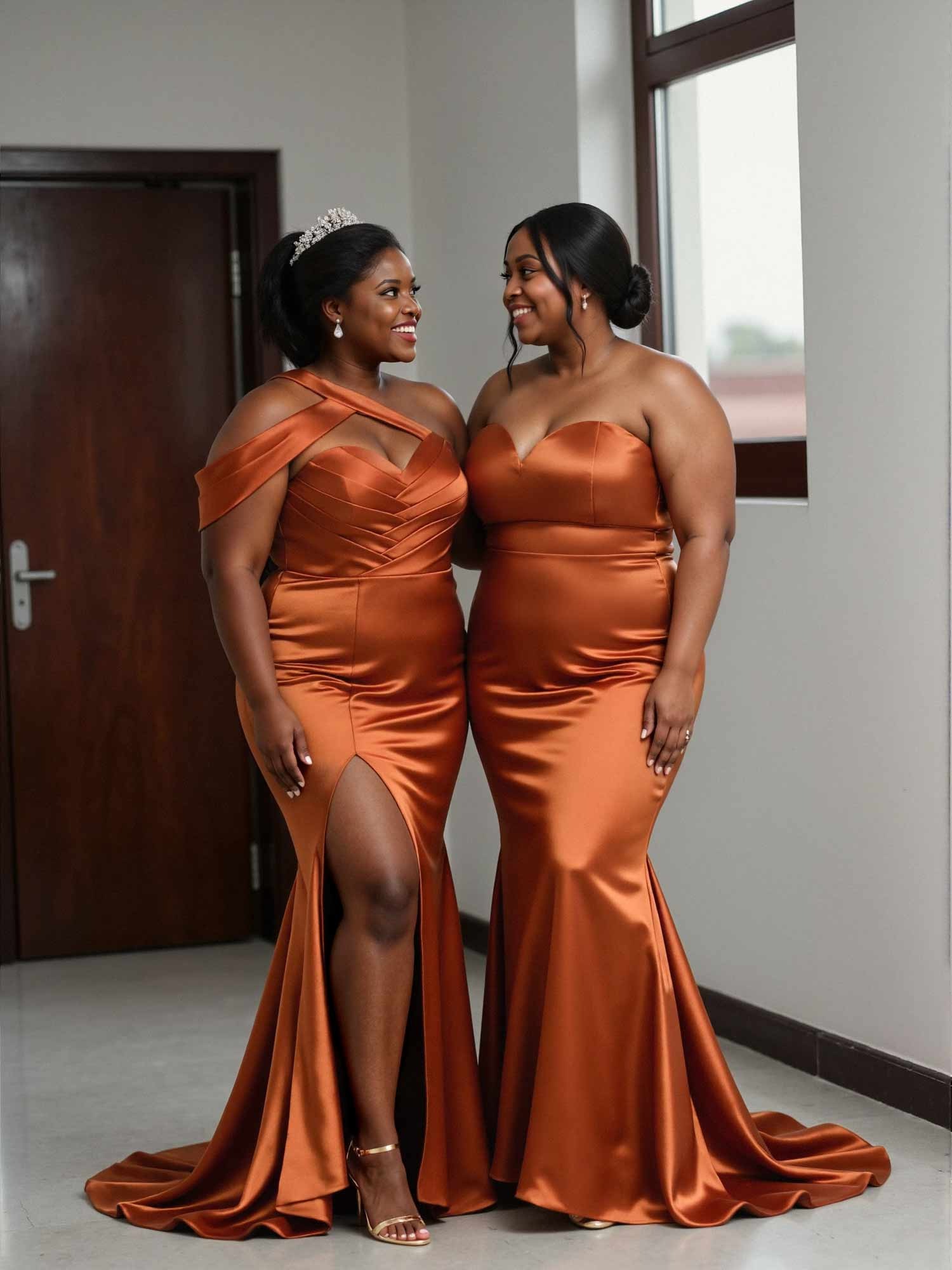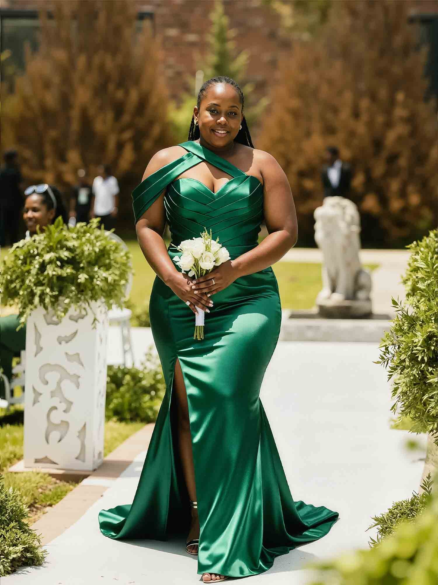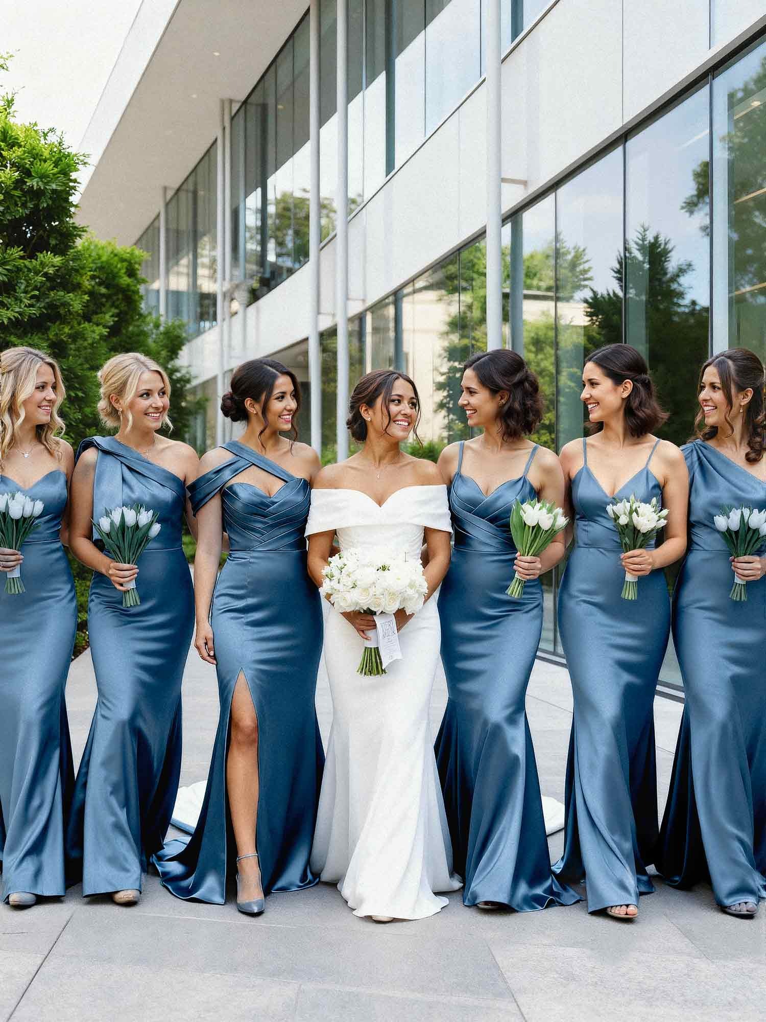 Luxurious satin bridesmaid dress with a high split, perfect for a chic wedding celebration. Sheath silhouette, column style, and a touch of modern elegance.