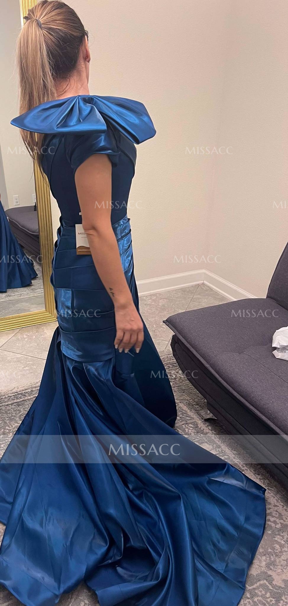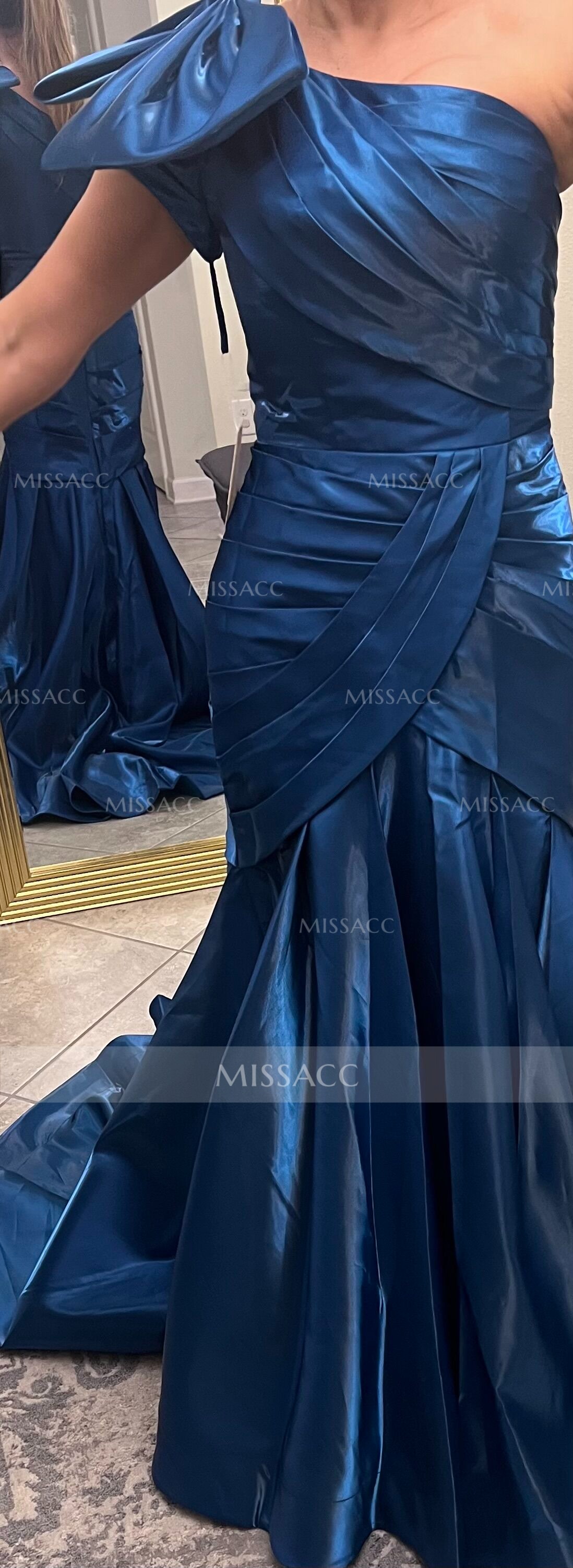 Luxurious satin fabric defines this one-shoulder trumpet mermaid dress, featuring a chic bow detail, perfect for a mother of the bride to shine at the special occasion.