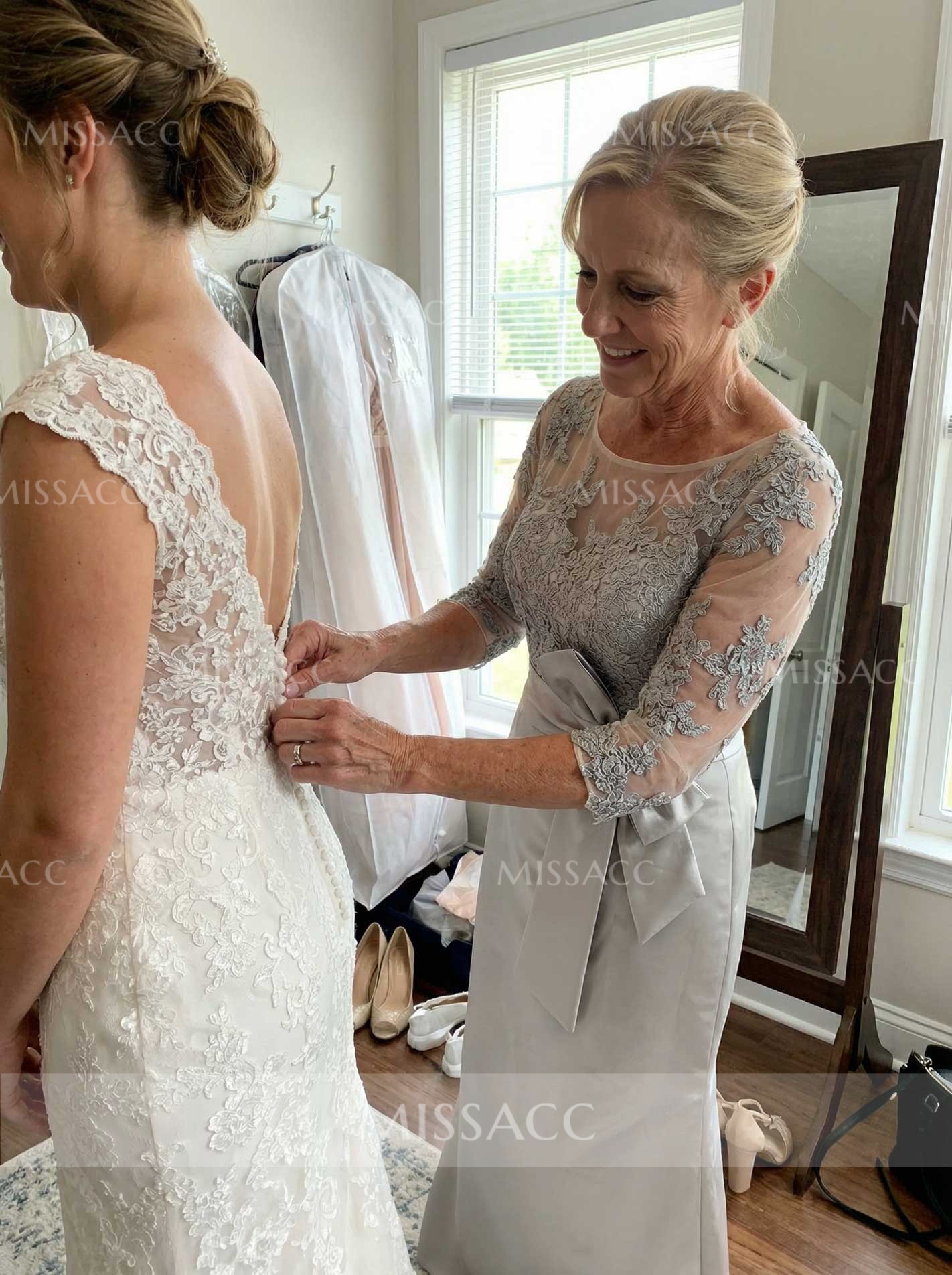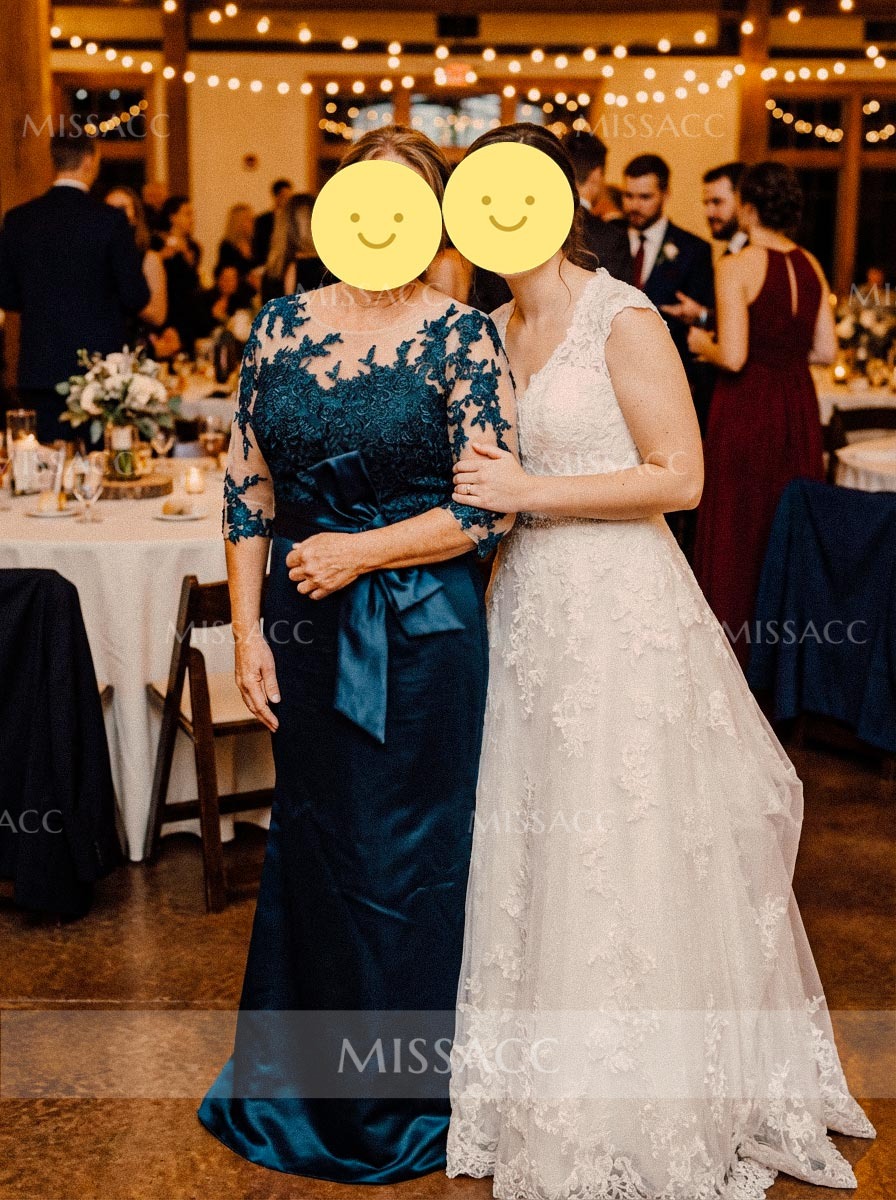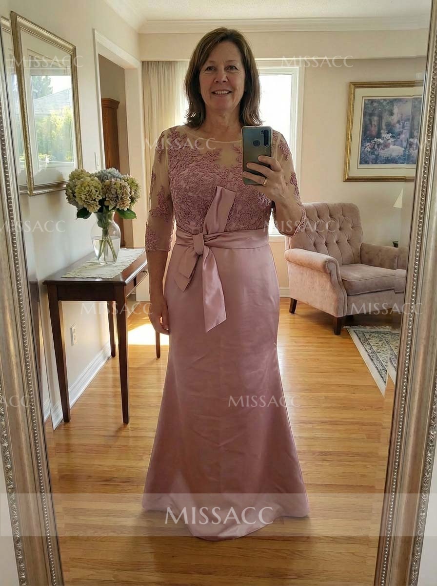 Leave mesmerized when you saunter around the ballroom in this mother of the bride dress. Flatteringly adorned with lace, this breathtaking gown features an illusion scoop neckline. The bodice also flaunts lace detailed 3/4 sleeves as an asymmetrical bow everyone decorates one side of the waist.The mermaid skirt sculpts and flares into a flowing sweep of train. You will definitely stand out at your opulent event in this stunning dress.