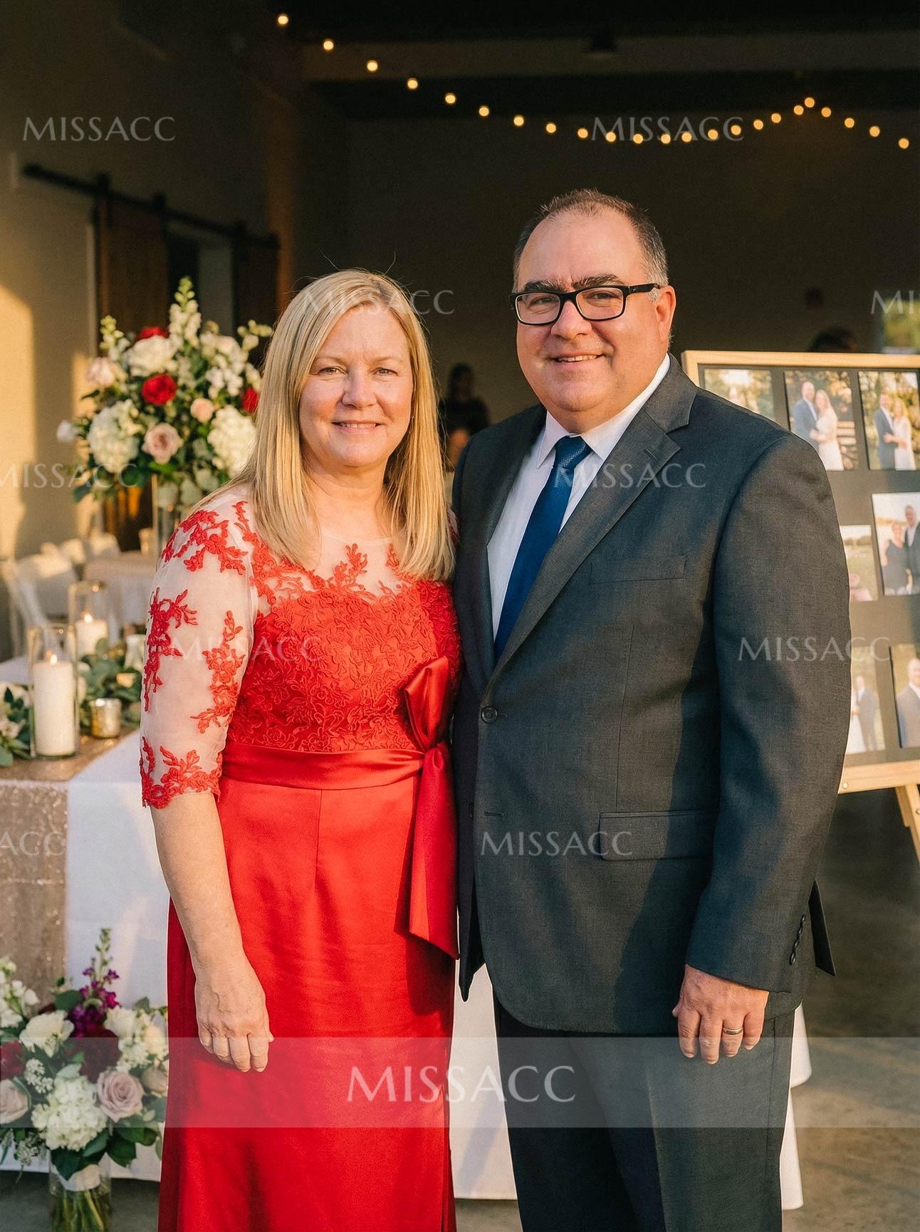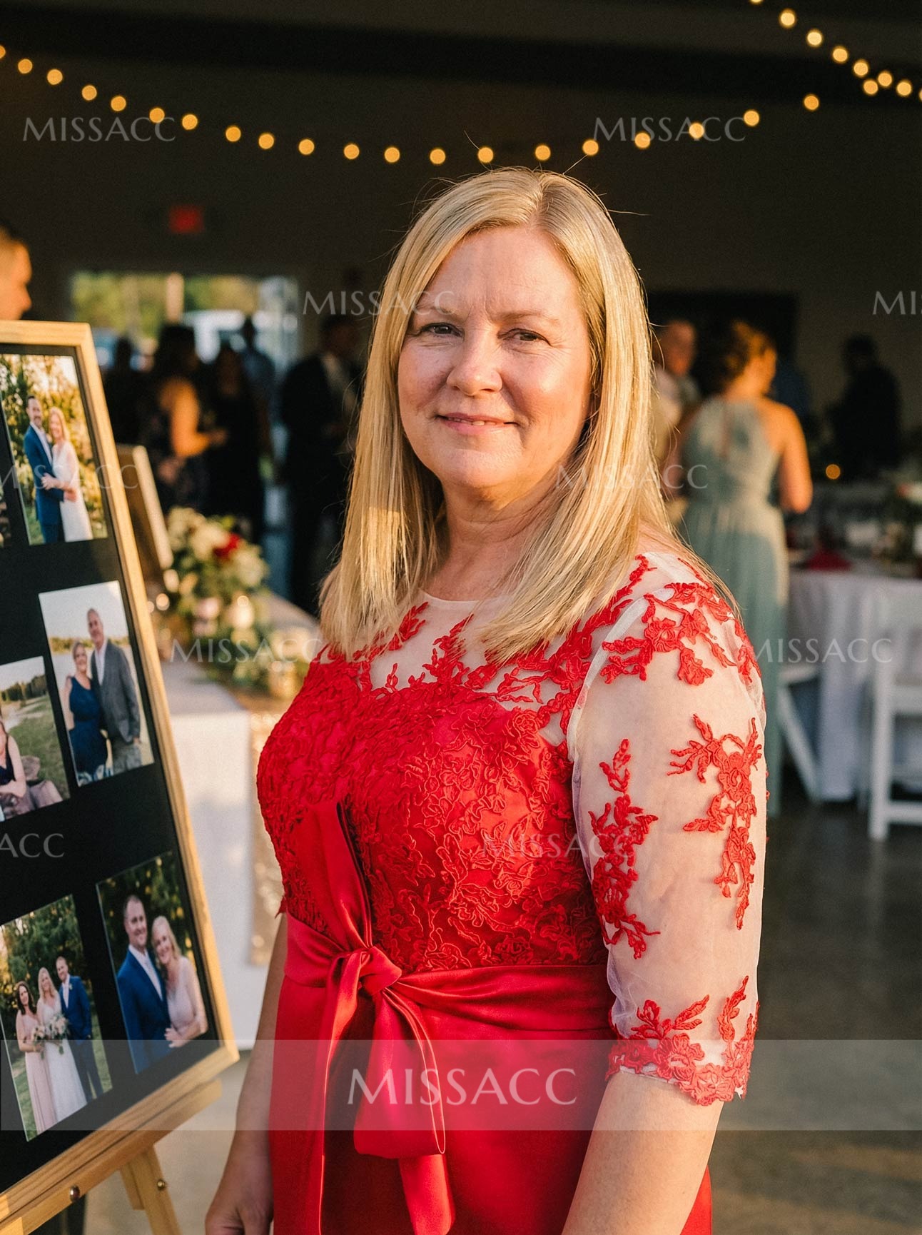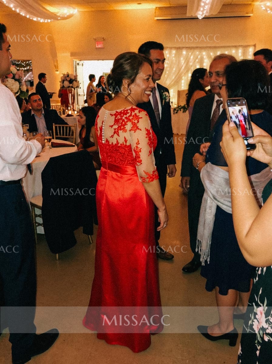 Leave mesmerized when you saunter around the ballroom in this mother of the bride dress. Flatteringly adorned with lace, this breathtaking gown features an illusion scoop neckline. The bodice also flaunts lace detailed 3/4 sleeves as an asymmetrical bow everyone decorates one side of the waist.The mermaid skirt sculpts and flares into a flowing sweep of train. You will definitely stand out at your opulent event in this stunning dress.