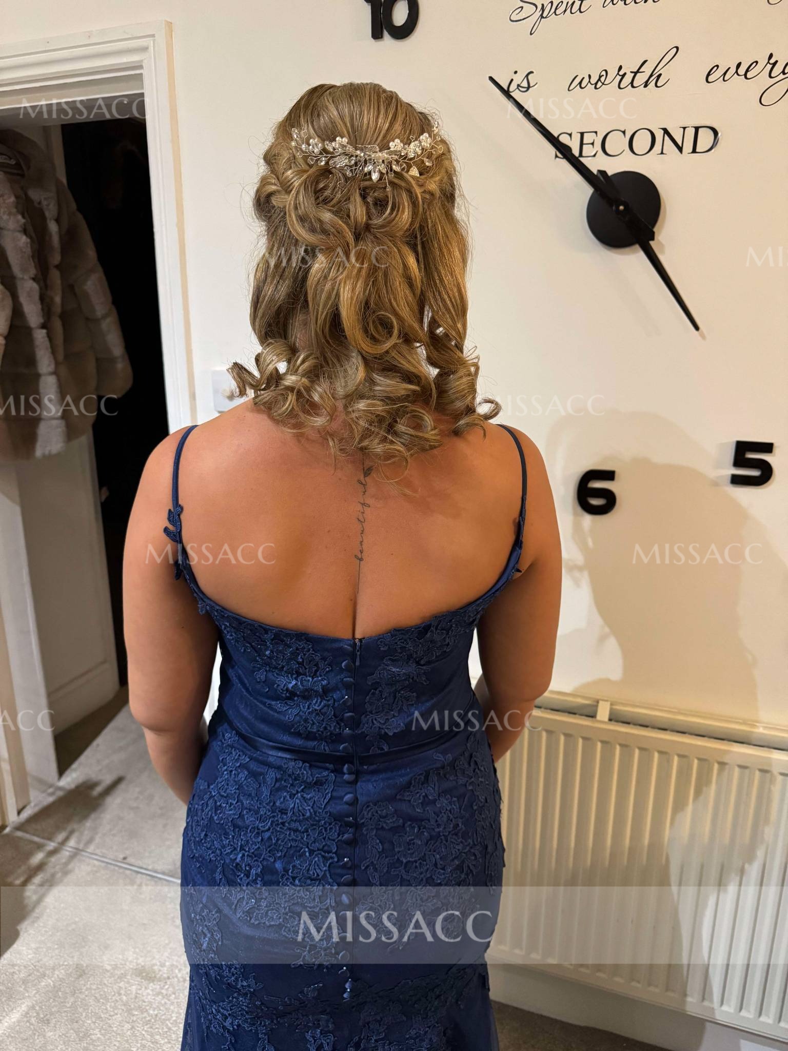 Unlock the air of grandeur with this exquisite prom dress. Cut from exquisite silk like satin and tulle fabric and bedecked with lace accents, this stunner features a dramatic sweetheart neckline. This ensemble also comes with a spaghetti straps. An eye-catching mermaid construction extending into a sweeping train. Make a sartorial statement at your special occasion in this prom dress.